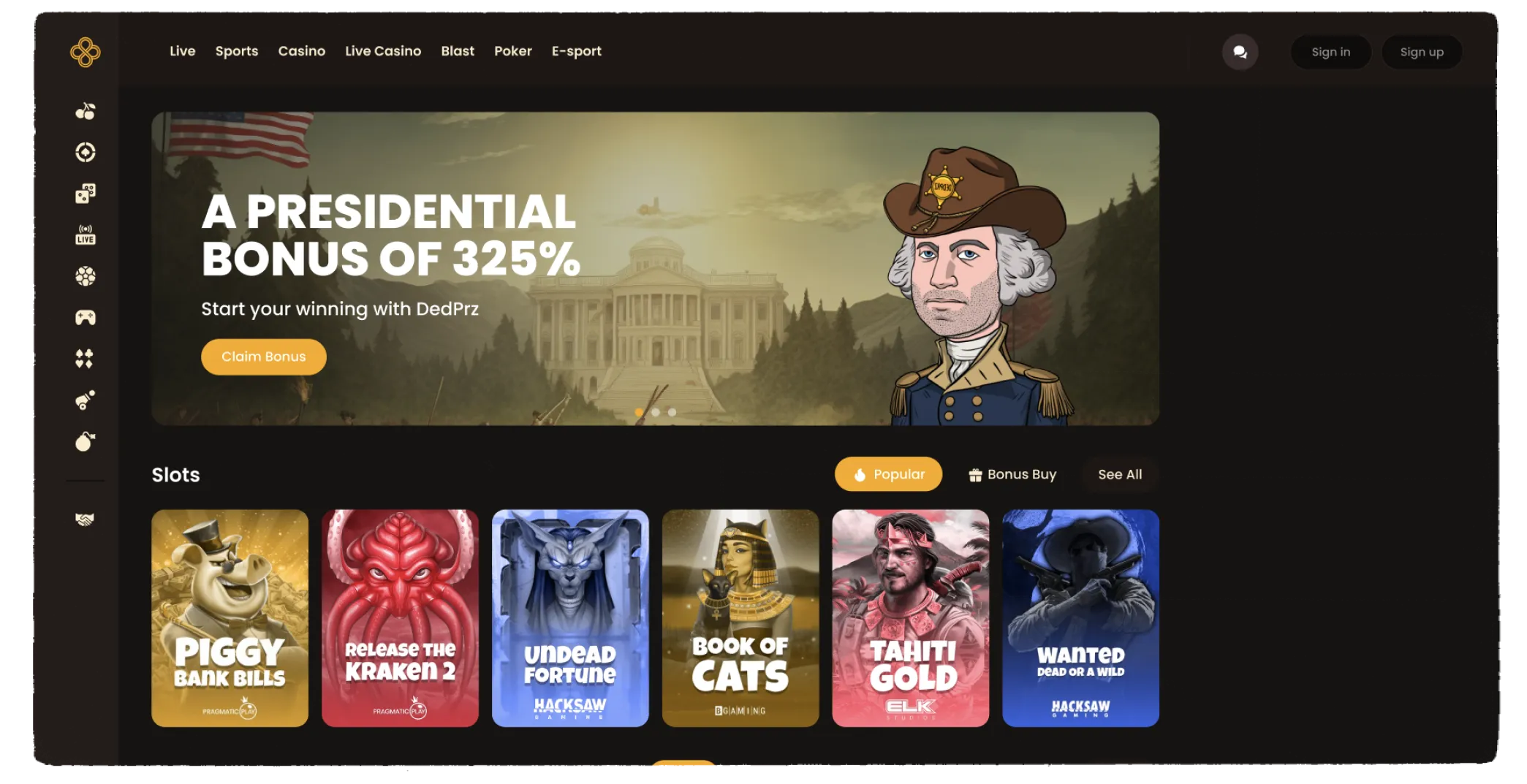 DEDPRZ Casino 提供多款来自顶尖供应商的老虎机游戏,涵盖传统经典机型、主题鲜明的视频老虎机及创新玩法。玩家可以根据喜好选择不同类型的游戏,体验多样的游戏乐趣。