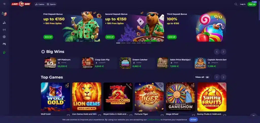 Lazybar Casino 设计了简洁直观的用户界面,无论是电脑版还是移动端都能提供顺畅的操作体验。玩家能够轻松浏览游戏、管理账户和参与活动。